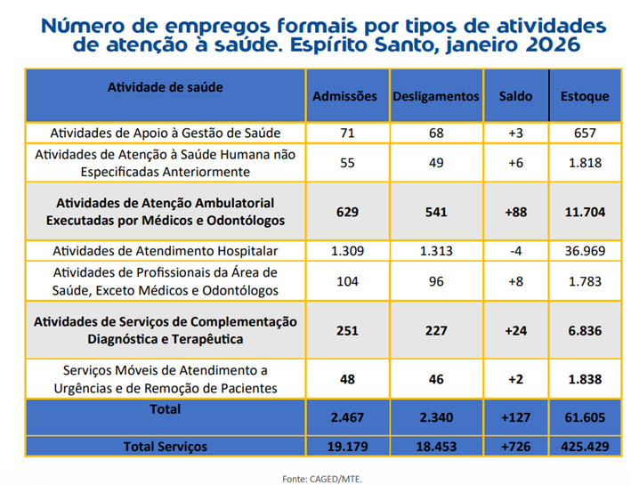 Clínicas, consultórios e serviços ambulatoriais, com atividades realizadas por médicos e dentistas, vêm redesenhando o mapa das contratações na saúde no Espírito Santo e lideraram a geração de empregos no setor em janeiro. Esses locais foram responsáveis por 88 dos novos postos de trabalho, totalizando 11.704 vínculos formais. Outro destaque do mês foi o segmento de serviços de complementação diagnóstica e terapêutica, que registrou saldo positivo de 24 empregos e alcançou 6.836 trabalhadores.