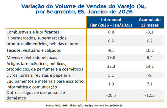 No entanto, quando analisado o desempenho interanual, o Espírito Santo apresentou avanço superior: o volume de vendas em janeiro de 2026 foi 3,2% maior que no mesmo mês de 2025, superando o crescimento nacional (2,8%) e da média do Sudeste (2,2%). O resultado indica maior dinamismo da atividade comercial no estado.