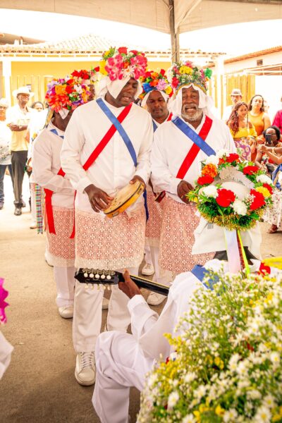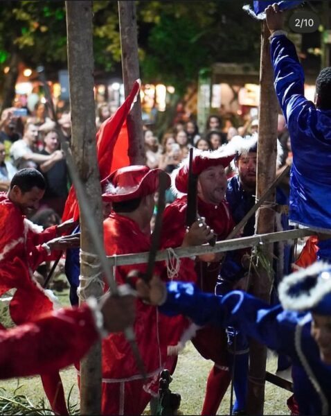 As celebrações começam com o tradicional Ticumbi de São Benedito, uma manifestação secular que une religiosidade e resistência. A festa presta homenagem ao Santo cuja imagem, segundo a tradição, permaneceu intacta quando atearam fogo ao tronco onde se escondia a figura lendária de Benedito Meia-Légua, líder quilombola e herói da região.