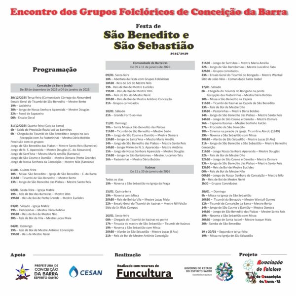 Nas próximas semanas, as atenções de Conceição da Barra se voltam as celebrações em louvor a São Benedito e São Sebastião. De 30 de dezembro a 20 de janeiro, a cidade se mobiliza para os festejos que integram o patrimônio cultural e religioso do município. As comemorações reúnem grupos de Ticumbi, Alardo, Reis de Boi, Jongo, Pastorinhas, manifestações que permanecem vivas ao longo da história barrense.