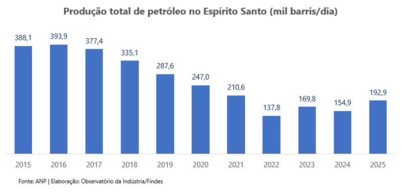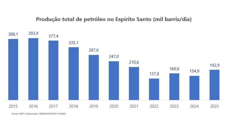 Os dados são do Painel da Agência Nacional do Petróleo, Gás Natural e Biocombustíveis (ANP), divulgados no final de janeiro de 2026, compilados pelo OBSERVATÓRIO FINDES. O retorno à vice-liderança marca uma recuperação relevante para o Estado, que entre 2007 e 2018 ocupou de forma consistente a segunda colocação nacional, sendo ultrapassado por São Paulo no período entre 2019 e 2024.