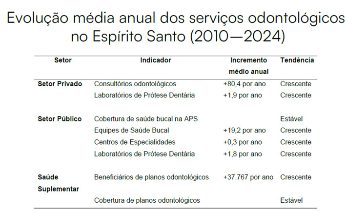 As análises são do Connect Fecomércio-ES (Federação do Comércio de Bens, Serviços e Turismo do Espírito Santo), com base na dissertação de mestrado de Antônio Lopes Júnior em Ciências Odontológicas pela Universidade Federal do Espírito Santo (Ufes) sob orientação da Professora Doutora Karina Tonini dos Santos Pacheco. Os dados foram provenientes do Instituto Brasileiro de Geografia e Estatística (IBGE), do Cadastro Nacional de Estabelecimentos de Saúde (CNES), do Conselho Federal de Odontologia (CFO), do Ministério da Educação (MEC), do e-Gestor da Atenção Primária e da Agência Nacional de Saúde Suplementar (ANS).