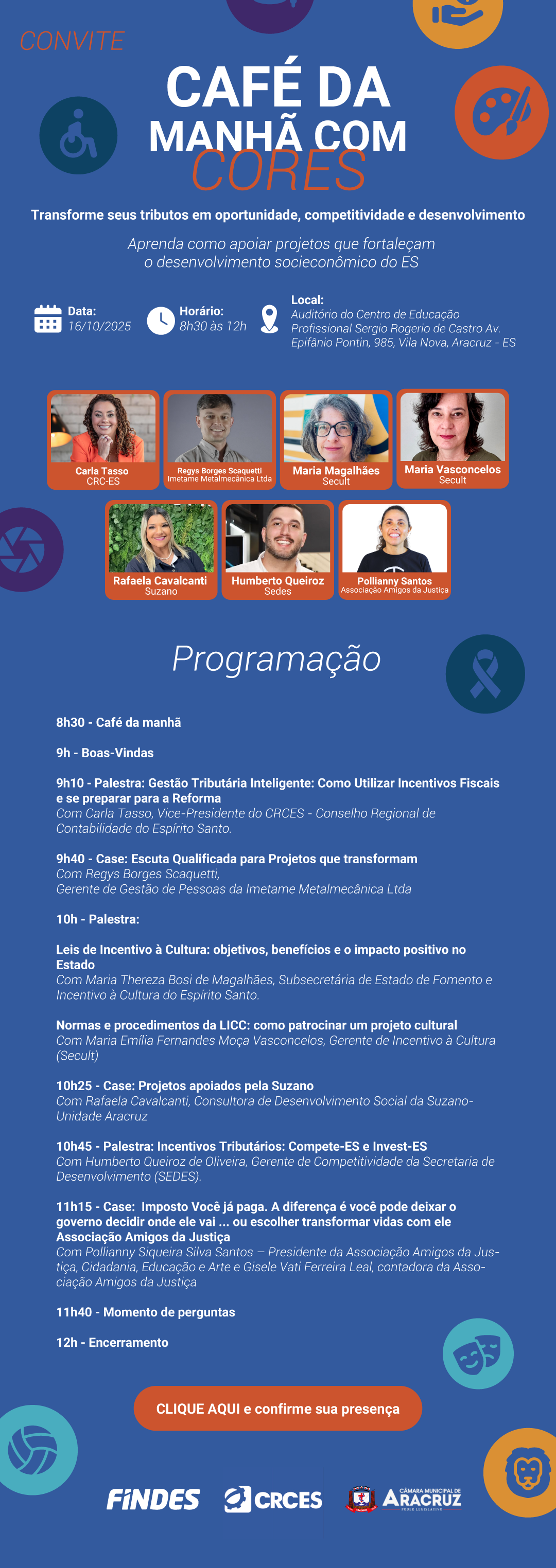 A programação do “Café com Cores – Aracruz” inclui palestras sobre incentivos fiscais e leis de incentivo à cultura, como patrocinar projetos culturais, apresentação de cases, entre outros.