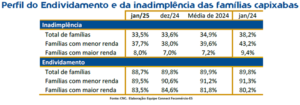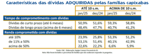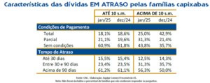 Em janeiro, as famílias que recebem até 10 salários mínimos afirmaram levar aproximadamente sete meses para quitar suas dívidas e as de maior renda, cerca de seis meses. Além disso, houve também aumento no volume de dívidas que estão em atraso há mais de 90 dias. Para as famílias de menor renda, o crescimento foi de 0,1 ponto percentual, e, para as de maior salário, de 6,3 pontos percentuais.