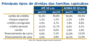 As famílias capixabas seguem tendo o cartão de crédito como a principal fonte de endividamento, sendo que seu uso, inclusive, cresceu. Além dele, nas famílias com menor renda, houve aumento na busca por crédito pessoal e financiamento de carros. Para aquelas que têm maior renda, os destaques foram a ampliação do uso do crédito consignado e a redução na procura por financiamento para compra de carros.