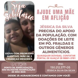 O site portaldeguacui.com.br em parceria com as redes sociais Portal de Guaçuí e perfil Tarcísio Tigrão no Facebook, se unem ao povo da região do entorno do Pico da Bandeira, em solidariedade a Mamãe Jéssica Silva da Silva (viúva, mãe de 03 filhos menores e com problemas de audição). Essa mãe, é mais uma que vem enfrentado o desinteresse social.