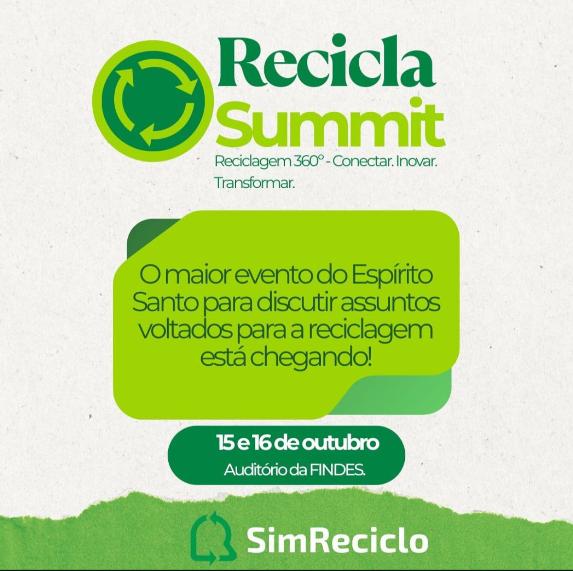 O Espírito Santo sedia, nos dias 15 e 16 de outubro, o Recicla Summit ES, maior evento do Estado do segmento e tem como tema a pauta “Reciclagem 360º: inovação, sustentabilidade e competitividade na nova economia circular”. O encontro é aberto ao público e acontece na Federação das Indústrias do Estado do Espírito Santo (Findes), reunindo especialistas e líderes do setor nacional e estadual, para discutir as estratégias e tecnologias da indústria de resíduos.