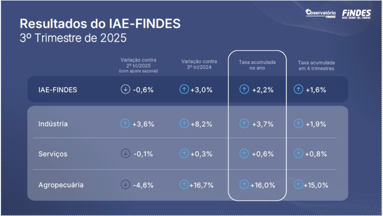 O desempenho da economia capixaba no acumulado dos nove primeiros meses de 2025 foi positivo. Segundo os dados consolidados do IAE-FINDES, o Estado cresceu 2,5% nesse período, comparado ao mesmo período de 2024, resultado acima do observado para o PIB do Brasil (2,4%).