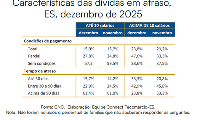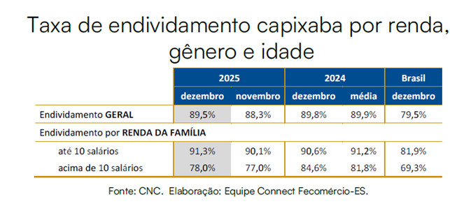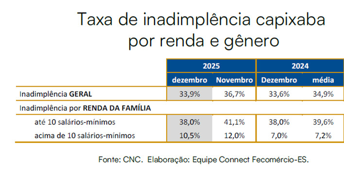 Em dezembro, a inadimplência capixaba ficou 2,9 pontos percentuais abaixo da registrada em novembro (39,7%). Com essa retração, o estado fechou o ano com um percentual inferior à média observada em 2024. As análises são do Connect Fecomércio-ES (Federação do Comércio de Bens, Serviços e Turismo do Espírito Santo), com base na Pesquisa de Endividamento e Inadimplência do Consumidor (Peic), da Confederação Nacional do Comércio (CNC).