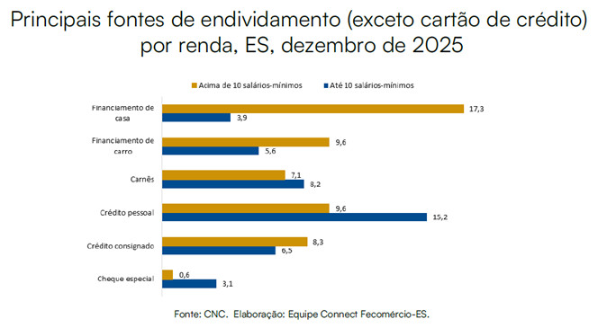 Apesar da queda da inadimplência, o endividamento, ou seja, pessoas com dívidas, segue elevado. Em dezembro de 2025, essa taxa atingiu 89,5%. O cartão de crédito permanece como a principal fonte de endividamento em todas as faixas de renda. Mas há diferenças no tipo de dívida. Entre as famílias de maior renda, predominam financiamentos de maior valor, como casa (17,3%) e carro (9,6%), além do crédito consignado (8,3%). Já entre as famílias de menor renda, o endividamento está mais associado a modalidades de curto prazo e custo elevado, como crédito pessoal (15,2%), carnês (8,2%) e cheque especial (3,1%), o que reforça a maior vulnerabilidade financeira desse grupo.