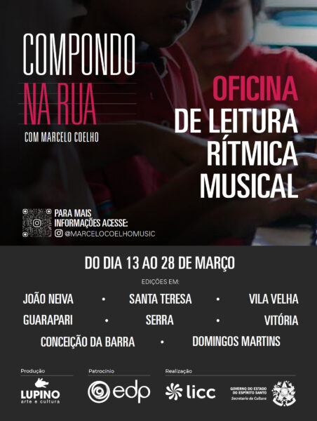 Os municípios de Vitória, Vila Velha, Serra, Guarapari, Conceição da Barra, Domingos Martins, João Neiva e Santa Teresa recebem, ao longo do mês de março, uma série de oficinas gratuitas de percepção rítmica. Ministradas pelo saxofonista e compositor Marcelo Coelho, as atividades são abertas a músicos, estudantes e entusiastas, sem exigência de conhecimento prévio em instrumento musical. As inscrições são gratuitas e devem ser feitas por meio do link https://forms.gle/stmfw9aAitHktgWk6.
