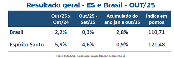 As análises são do Connect Fecomércio-ES (Federação do Comércio de Bens, Serviços e Turismo do Espírito Santo), com base nos dados da Pesquisa Mensal de Serviços (PMS), realizada pelo Instituto Brasileiro de Geografia e Estatística (IBGE).