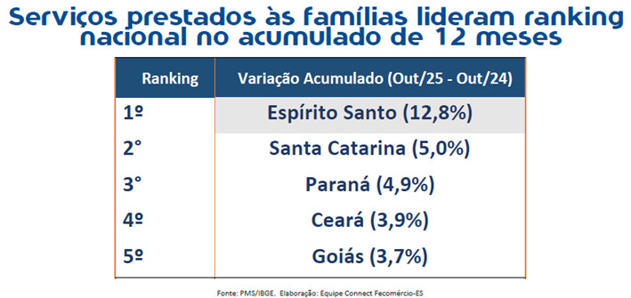 Entre os segmentos analisados, o grande destaque foi o de serviços prestados às famílias, no qual o Espírito Santo ocupa a 1ª posição no ranking nacional, com crescimento de 12,8%. O avanço expressivo demonstra a retomada do consumo em atividades como alimentação fora do lar, turismo, lazer e serviços pessoais.